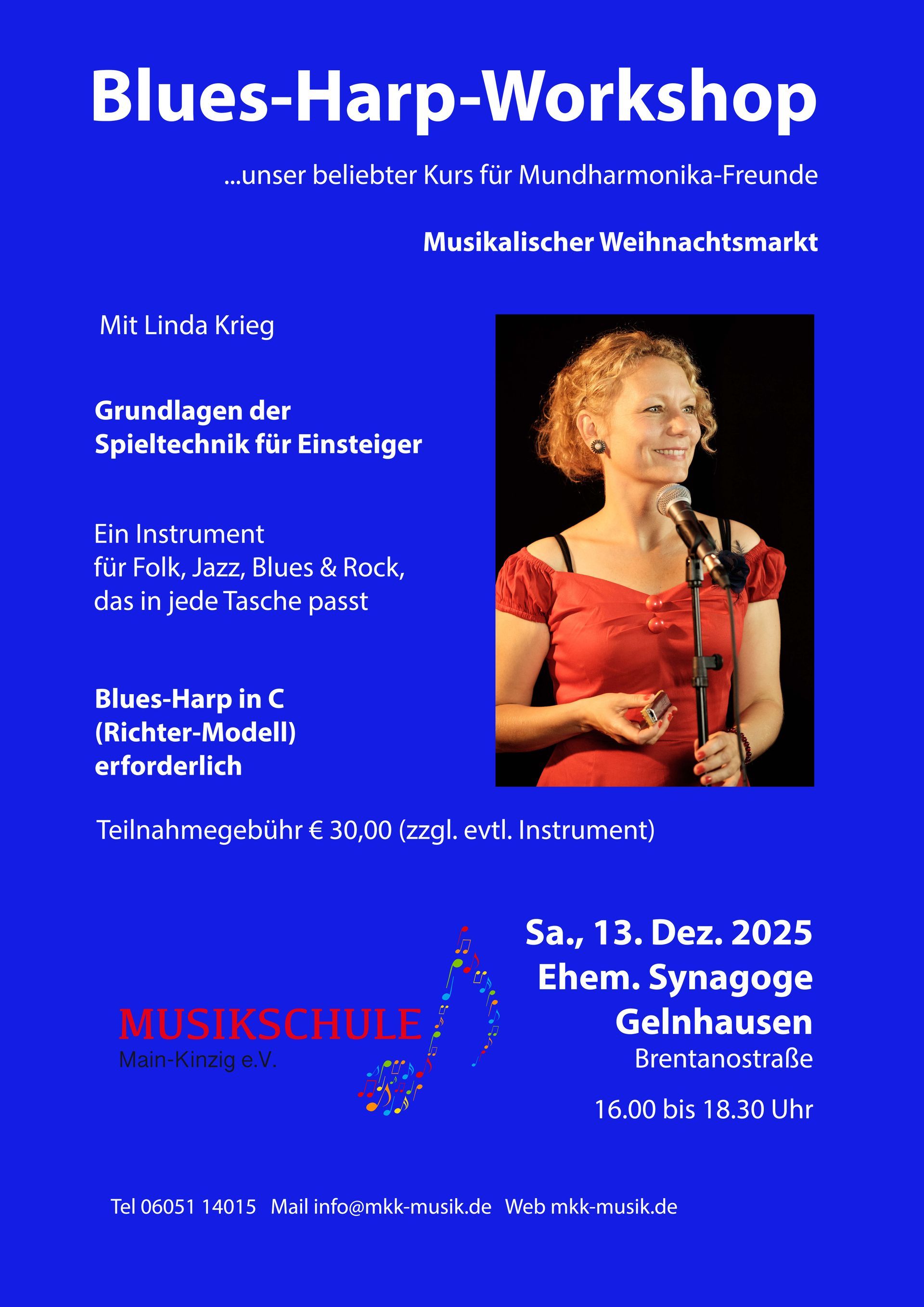 Am Samstag, den 13. Dezember 2025, findet zum wiederholten Mal ein überregionaler Workshop der Musikschule Main-Kinzig für Mundharmonika-und Bluesharp-Freunde, mit Linda Krieg von 16.00 Uhr bis 18.30 Uhr in der ehemaligen Synagoge Gelnhausen statt.